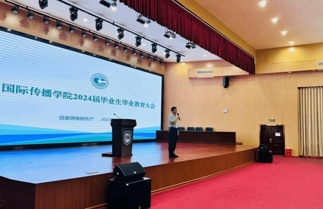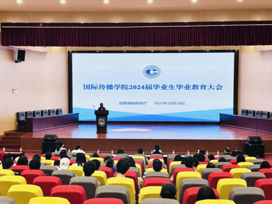 国际传播学院2024届毕业生毕业教育会议在海甸校区田家炳楼二楼报告厅举行,2024届全体研究生和本科生参加毕业教育大会,会议由党总支书记谢辉凡主持。