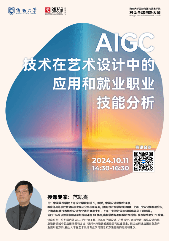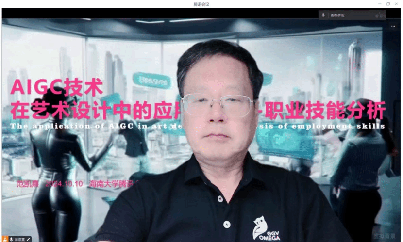 2024“对话全球创新大师讲座”《AIGC技术在艺术设计中的应用和就业职业技能分析》在线上举行,由中国美术学院范凯熹教授主讲,设计系专业教师李珂博士担任学术主持,线上线下共100名左右师生同时参与。