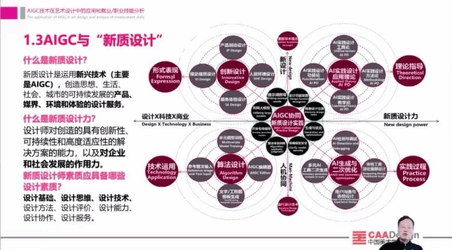 在此次讲座中,范凯熹教授从对未来设计的思考开始吸引同学的注意力,从AIGC生成式设计的概念与发展过程,逐步剖析AIGC带给艺术设计新质发展的前景,提出AIGC协同新质设计实践的框架图,给同学们带来未来设计思维的全新冲击。