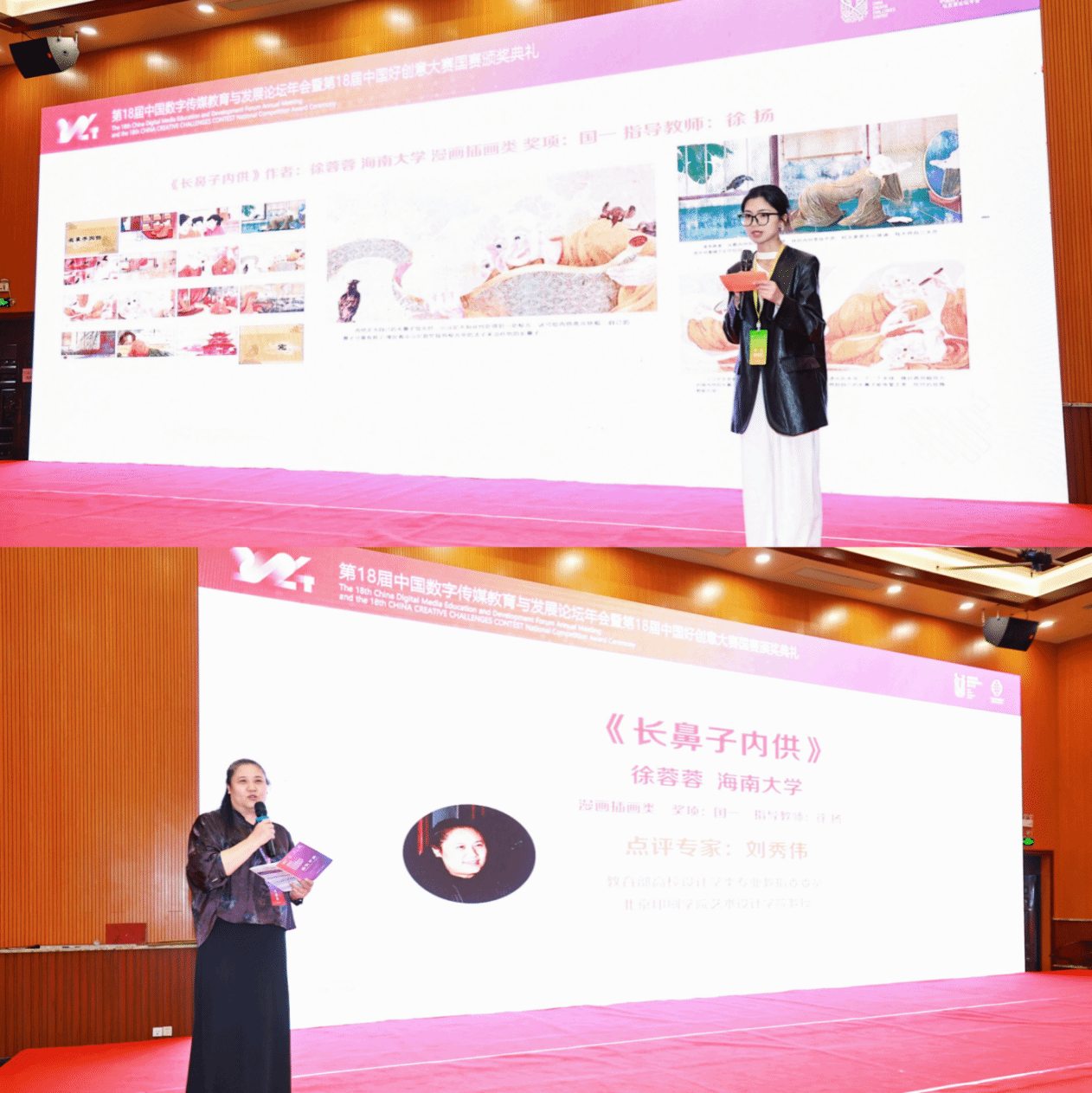 学生徐蓉蓉荣获国赛一等奖,并作为获奖嘉宾邀请上台进行作品创作分享。教育部高校设计学专业教指委委员、北京印刷学院艺术设计学院教授刘秀伟现场点评认为:这部插画作品在艺术风格、主题表达、技术手法、情感传达以及文化内涵等多个方面都表现出色,是一次成功的艺术创作实践。