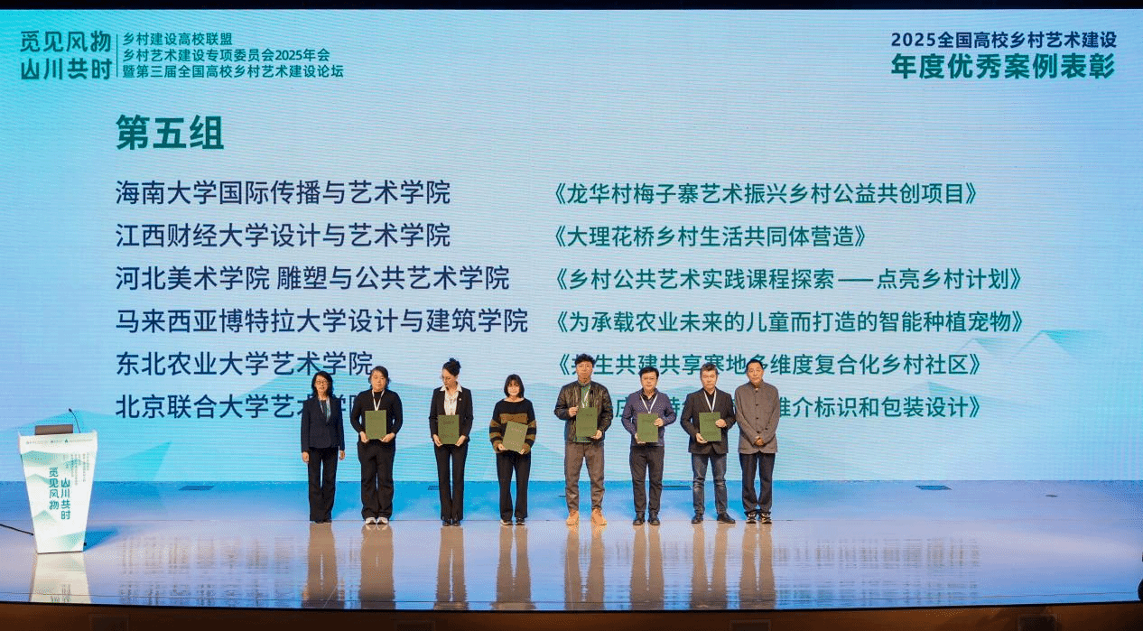 “海岛艺术创新研究”团队作品《龙华村梅子寨艺术振兴乡村公益共创项目》从来自60余所高校的近300件参展作品中脱颖而出,荣获“2025全国高校乡村艺术建设年度优秀案例”。该团队由包格日乐吐教授领衔,张春梅、王莉、志勇、束博等师生共同参与组建。