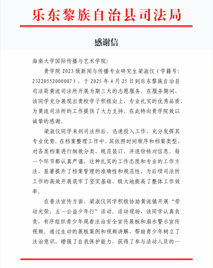发来感谢信,对2023级新闻与传播专业研究生梁淑仪同学在黄流司法所开展的高质量志愿服务表示感谢。