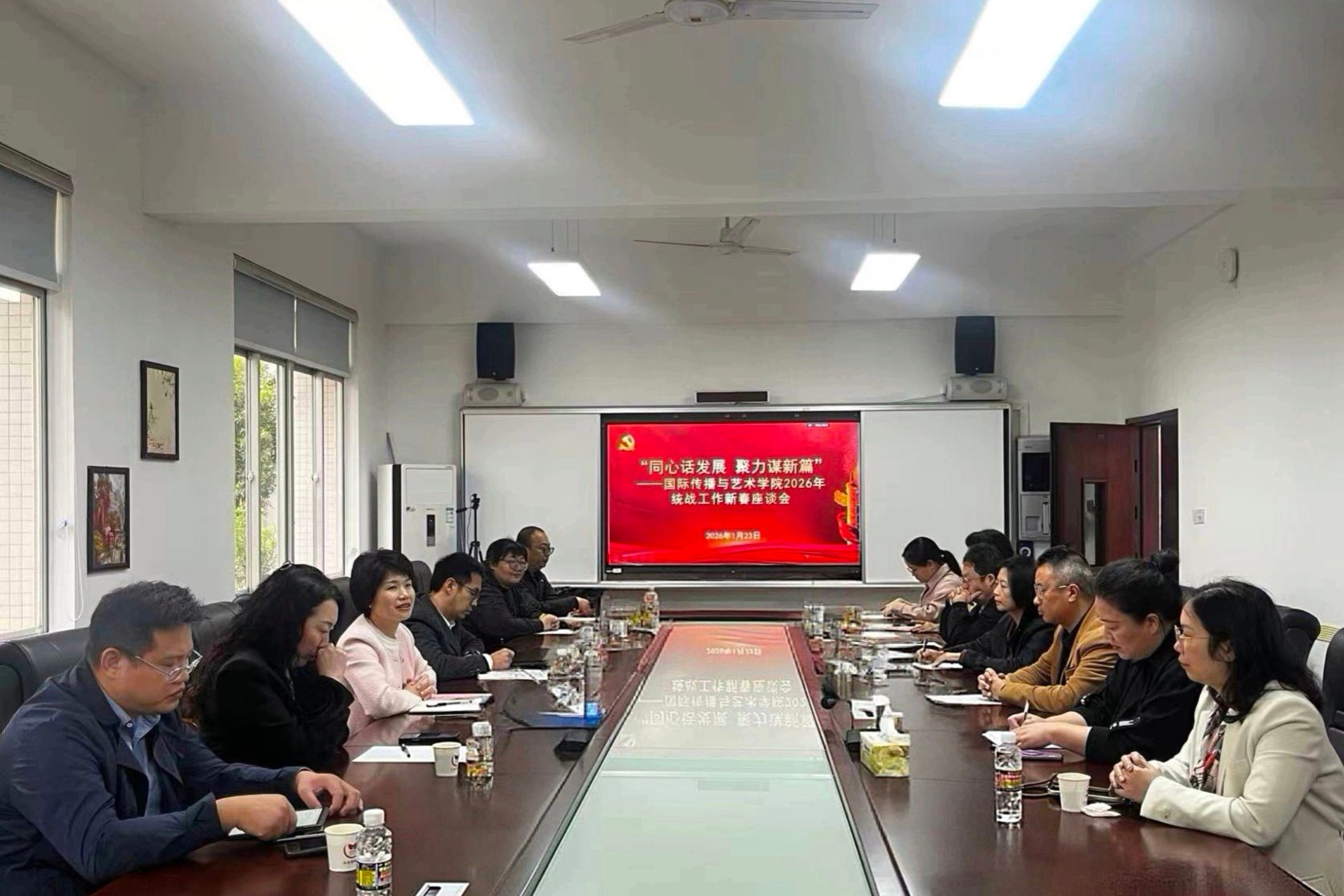 2026年统战工作新春座谈会在学院102室召开。学院党委书记何映敏主持会议,党委副书记陈鹏,副院长张军军、元志东出席,学院各民主党派及无党派人士教师代表参会。