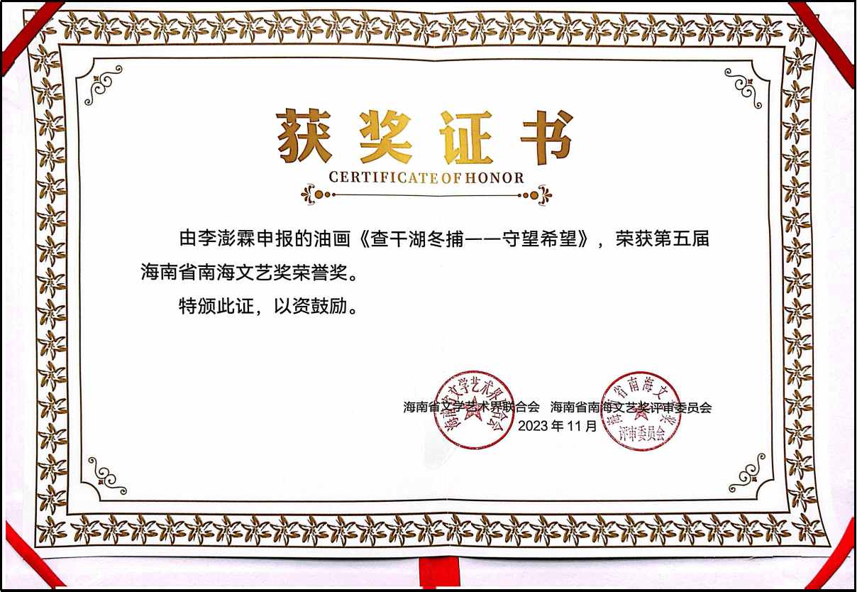 艺术团申报的《把蓝色还给海洋》获“舞蹈类奖”,汪荣老师撰写的文学评论作品《阿来文学创作中的族性表述与跨族际想象》获“文艺理论评论类奖”,李澎霖老师创作的油画作品《查干湖冬捕——守望希望》获“荣誉奖”。